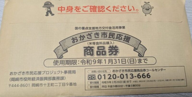不着、使い方、対象店舗などで迷った場合は、「おかざき市民応援商品券コールセンター」に問い合わせできます。電話番号は0120-013-666、受付時間は平日午前9時から午後5時まで、受付期間は2027年2月26日までです。制度の詳細確認はもちろん、「届いていない」「どこで使えるか知りたい」といった相談時にも役立ちます。