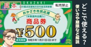 使い方はとてもシンプルです。自宅に届いた500円券を、岡崎市公式ページに掲載されている取扱店舗で会計時に渡すだけです。特別なアプリ登録や事前申請は不要です。